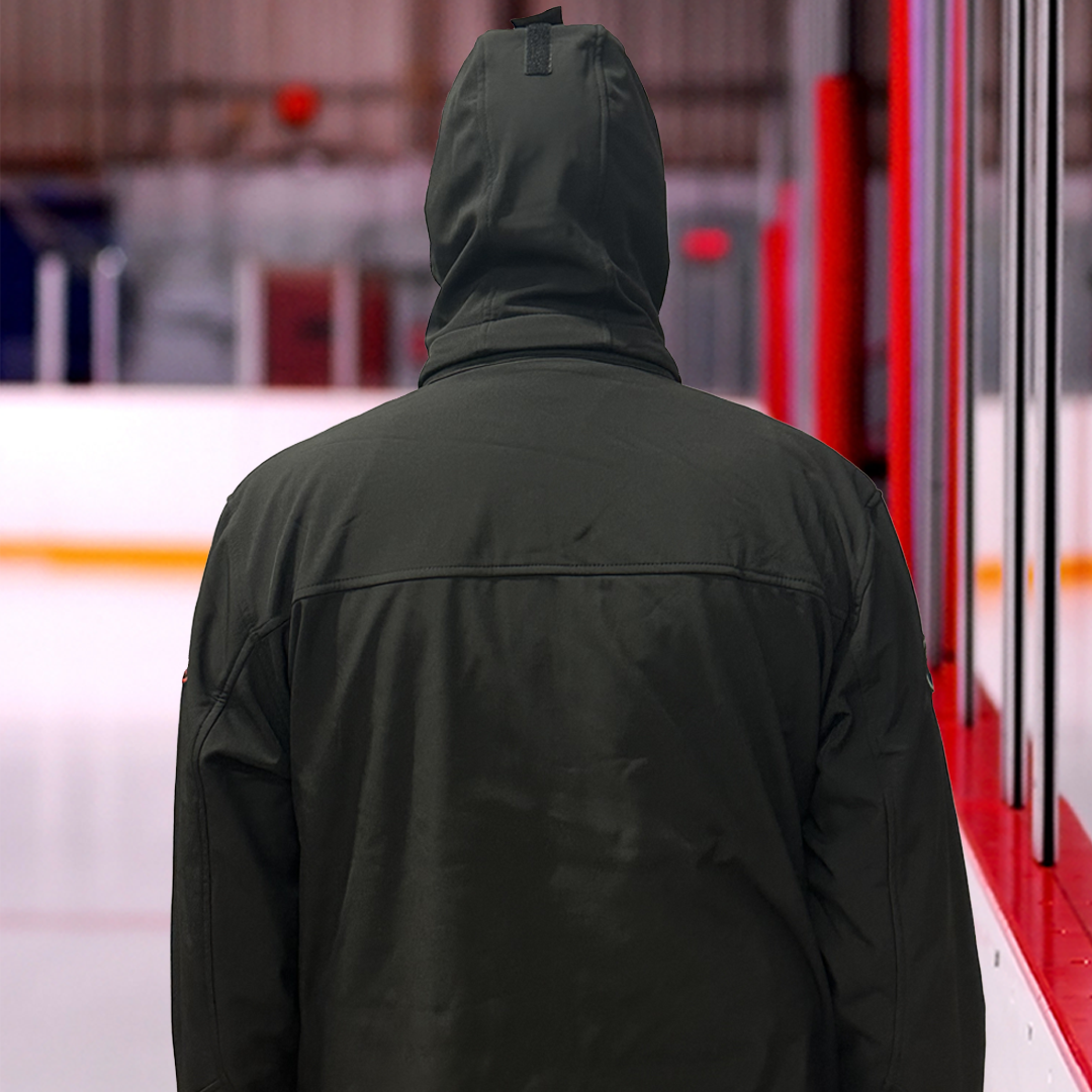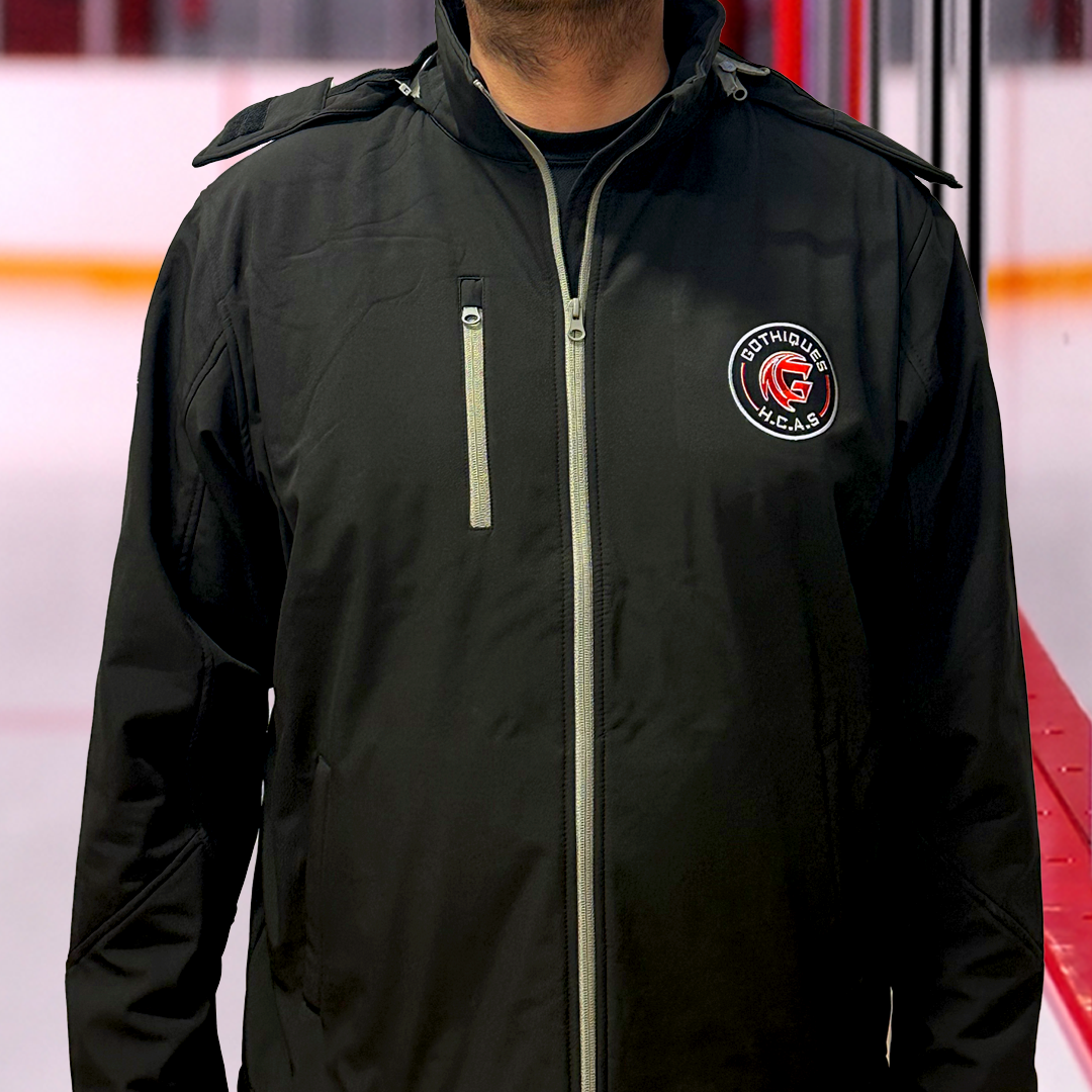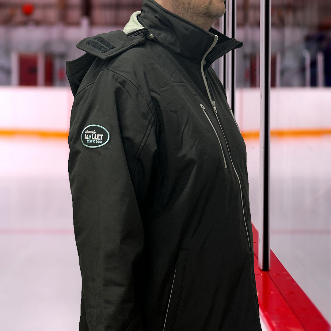 Softshell à capuche avec logo club sur le coeur, initiales en anti-coeur et partenaires sur les manches